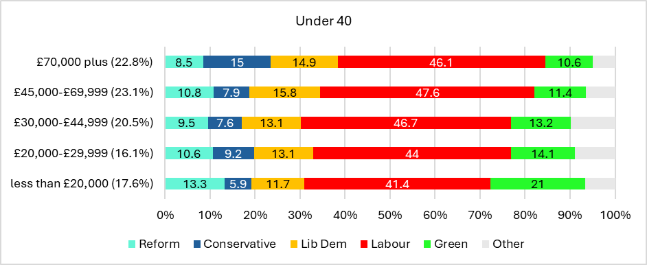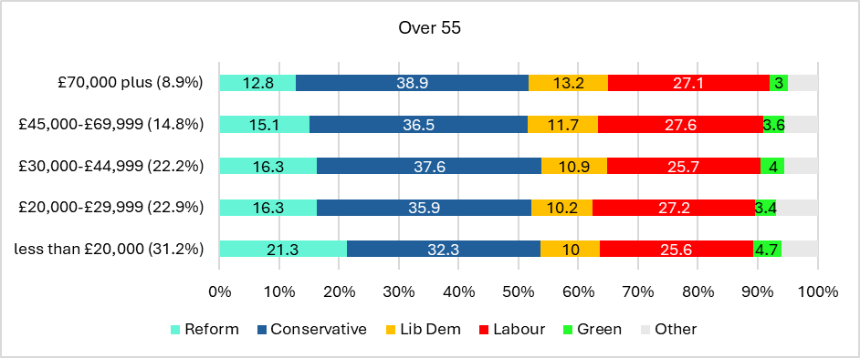 Let us then consider the relationship between income and voting when broken down by age. Figure 2 shows the relationship between income and voting amongst two age groups: under 40s and over 55s. Note first how the income distribution varies by age – in brackets I show the share of each income group in the sample. Those in households with incomes of over £45,000 represent 46% of those under 40 compared to just 24% of those over 55, with those on the lowest incomes also forming a significantly higher share of over 55s. Again, this does not mean that older voters are worse off – they are exposed typically to far lower housing and living costs – but you can see how it might influence the income-voting patterns observed above. Indeed, there is a stronger relationship between income and voting when considered by age group. The Conservatives perform stronger amongst high income voters in both groups – with the pattern especially steep amongst younger voters. The Greens also enter the equation; amongst younger voters, they are clearly the party with which low income is most strongly associated, whilst Reform support exhibits a low income skew in both groups. Interestingly, for Labour there remains no strong relationship in either group.