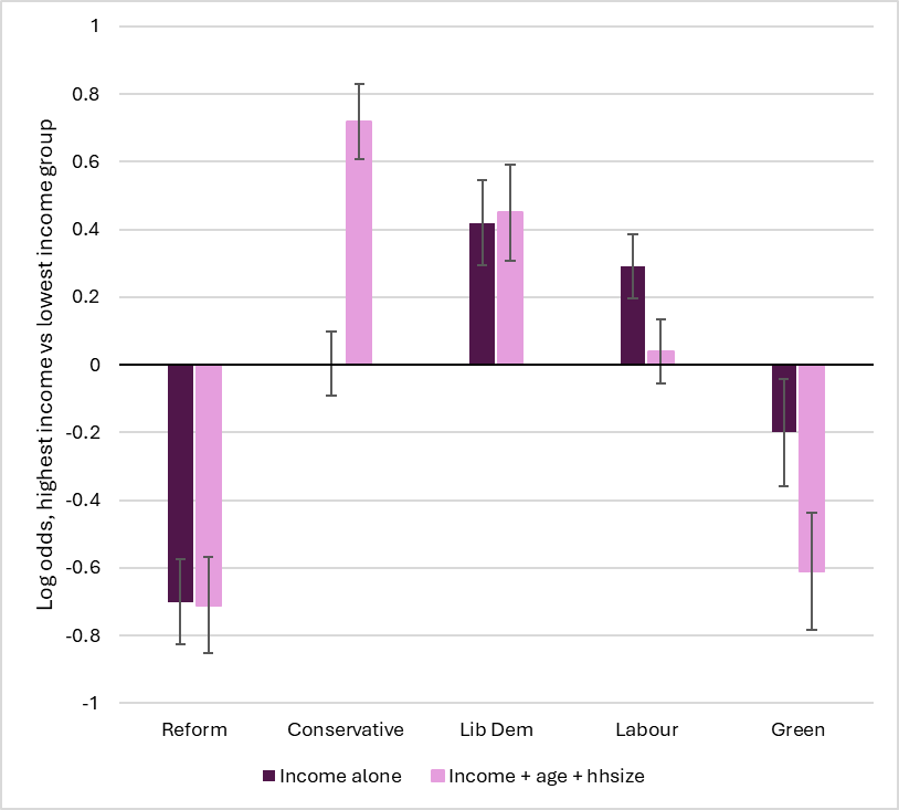 Figure 3: effect of income on voting for each party at the 2024 UK General Election, before and after controlling for age and household size. Source: BES